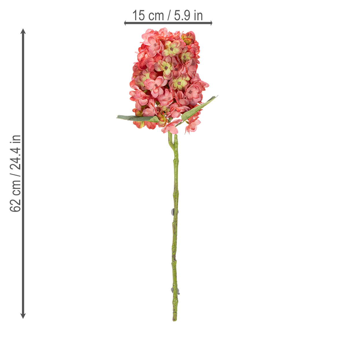 Tato umělá hortenzie v růžové barvě zaujme nejen svým vysoce kvalitním zpracováním s použitím polyesteru a plastu, ale také svou všestranností. S výškou 62 cm a jemnými květními hlavičkami je ideální do vysokých váz, kreativních květinových aranžmá nebo jako výrazný akcent. Jemné barevné přechody od růžové po krémovou dodávají designu přirozený a harmonický vzhled, který doplní jakýkoli styl, od moderního po venkovský.