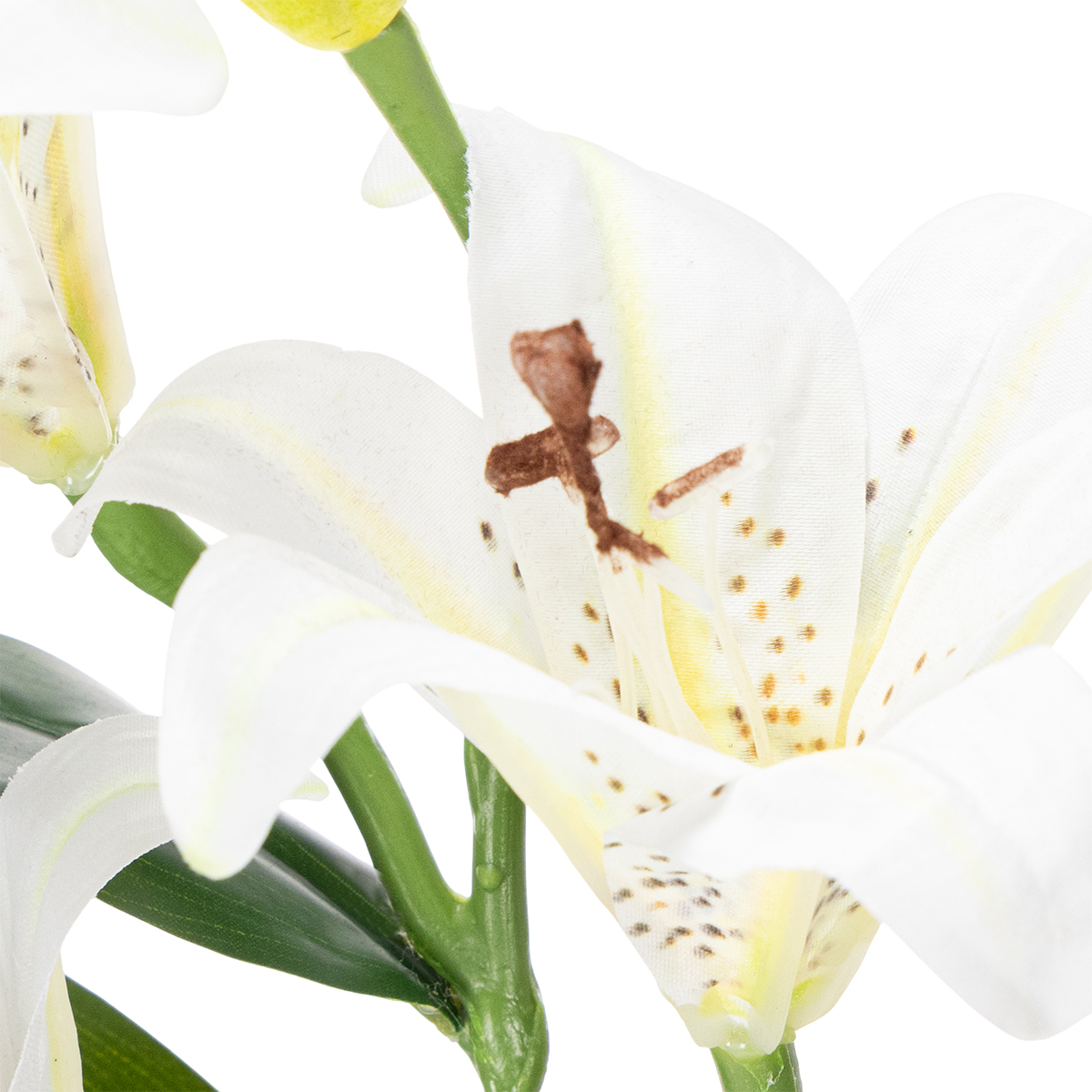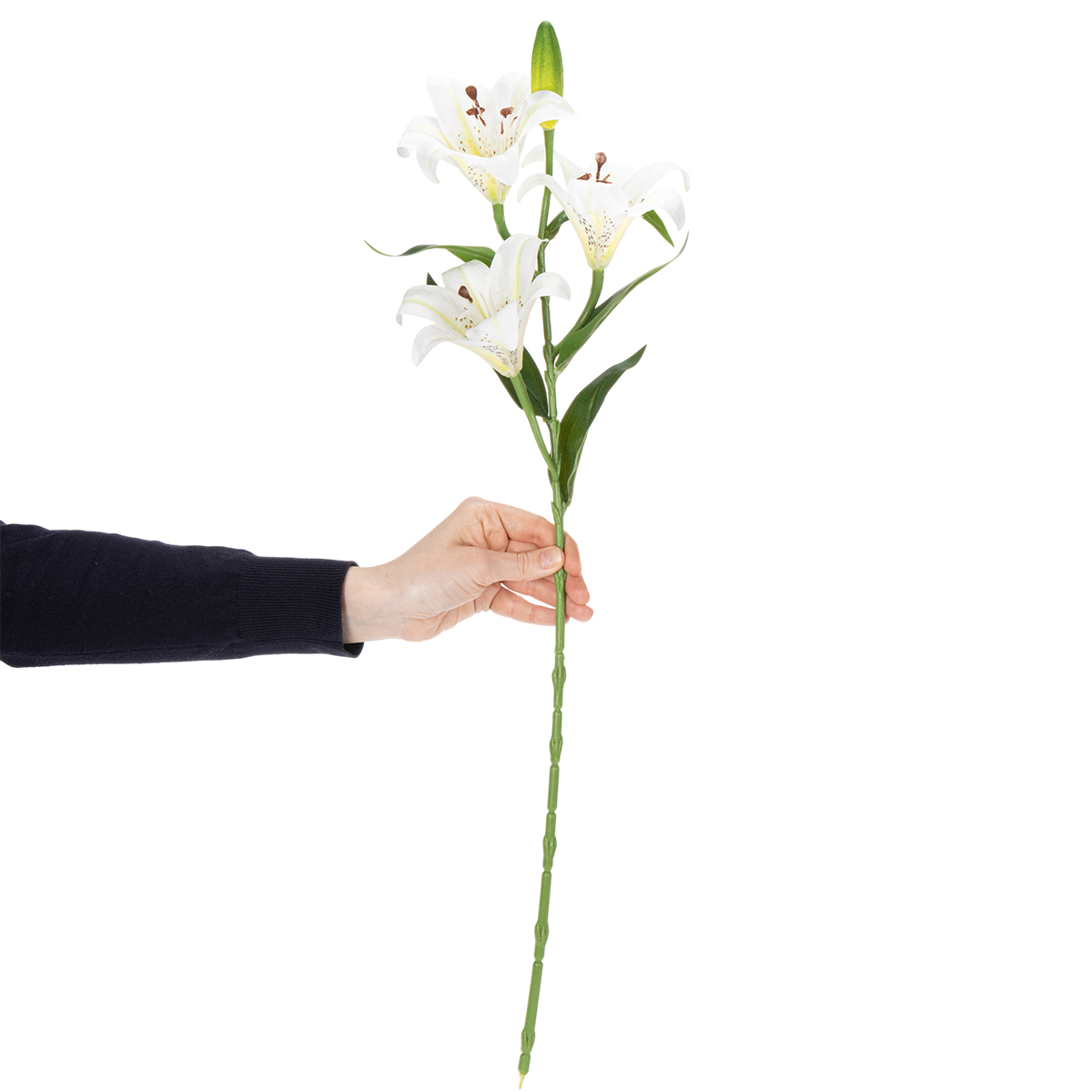 Tyto vysoce kvalitní umělé lilie zaujmou svým realistickým designem a decentním šarmem. Jsou ideální pro zvýraznění minimalistických obývacích pokojů, ale také vypadají úžasně v romantickém venkovském stylu. S výškou 66 cm lze květiny zakomponovat do váz i větších aranžmá. Polyesterový a plastový materiál zajišťuje přirozený vzhled a příjemný pocit na dotek.