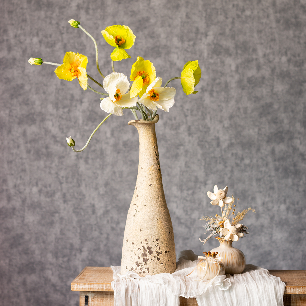 Tato 95 cm vysoká kytice umělých vlčích máků vynikne v každé místnosti. Zářivě žluté květy v kombinaci s přírodními tvary a elegantně zakřivenými stonky dodávají tomuto aranžmá stylový a moderní charakter. Ideální pro fanoušky moderního interiérového designu, skandinávského stylu nebo vzhledu městské džungle. Tato sada tří stonků s průměrem 30 cm a výškou 95 cm nabízí dostatek prostoru pro různé dekorační nápady. Ať už jsou aranžovány jednotlivě v jednoduché váze, nebo v kombinaci s jinými umělými květinami a vytvoří tak bujnou kytici – možnosti jsou nekonečné! Vlčí máky se obzvláště dobře hodí k bílým nebo zeleným akcentům. Kombinace polyesteru a plastu zajišťuje odolnost a květy a listy vypadají neuvěřitelně realisticky. Ideální pro ty, kteří oceňují přírodní vzhled, ale nechtějí se vzdát trvalé svěžesti. A žádná zdlouhavá údržba? Na to můžete zapomenout!