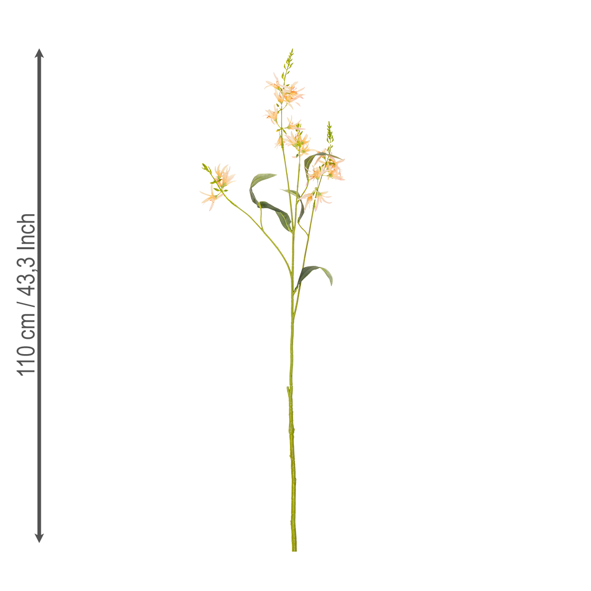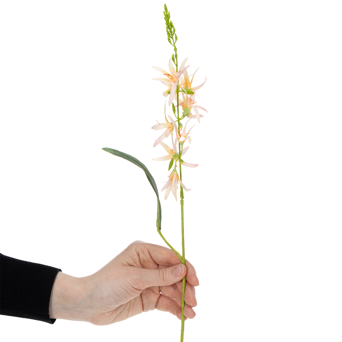 Tato umělá lilie s dlouhým stonkem zaujme svým vysoce kvalitním polyesterem a plastem. Tato kombinace zajišťuje nejen realistický vzhled, ale i odolnost. Jemné detaily okvětních lístků a realistické zbarvení dodávají lilii okouzlující, téměř klamně skutečný vzhled. Své plné kouzlo odhalí zejména na svatbách, kde je touha po elegantním designu a nadčasovosti. Ať už jako ústřední prvek aranžmá na stole, ve vysokých vázách nebo jednoduše v moderní váze na hostinském stole – tato lilie je skutečným poutačem.