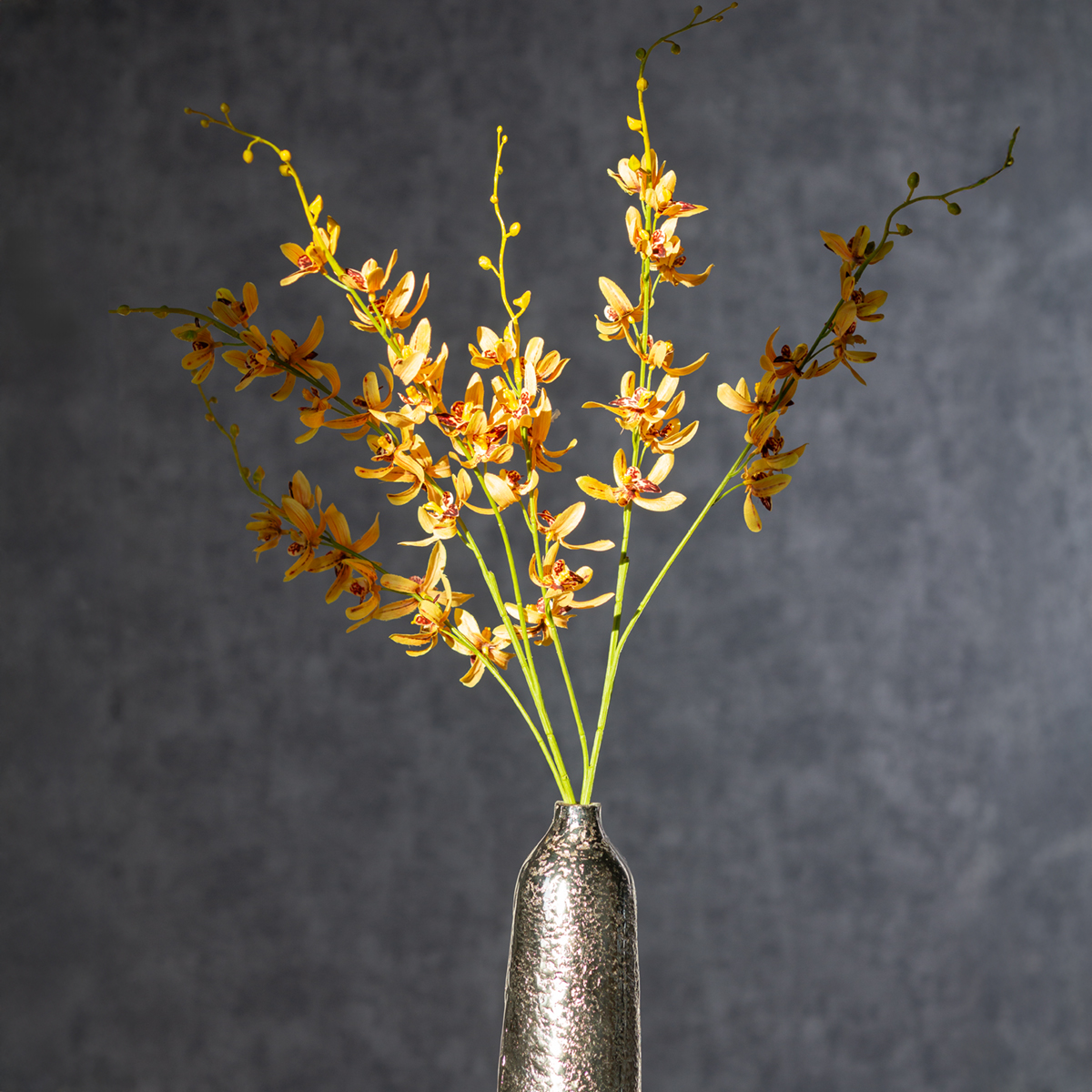 Orchidej Cymbidium je považována za symbol elegance a sofistikovanosti. Díky vysoce kvalitnímu zpracování je prakticky nezničitelná a přesto skutečně upoutá pozornost. Kombinace žluté hedvábné tkaniny, která dodává autentický vzhled, a pružné plastové stopky ji činí nejen vizuálně přitažlivou, ale i praktickou pro vaše kreativní projekty. Použijte ji k ozdobení velkých váz nebo orchidej zkombinujte se zelenými větvemi a dalšími umělými květinami pro působivé aranžmá.