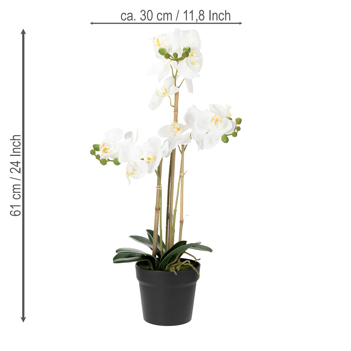 Naše vysoce kvalitní umělá orchidej snadno dodá vašemu aranžmá stylový nádech. Aranžmá obsahuje tři elegantní bílé kvetoucí stonky ozdobené malými zelenými poupaty. Vše bezpečně odpočívá v černém květináči, který se decentně hodí do jakéhokoli designu místnosti. Umělá květina je vyrobena z pečlivě vyrobené látky a plastu, což jí dodává nejen realistický vzhled, ale také odolnost. Díky šířce a průměru přibližně 25 cm se perfektně hodí do obývacích pokojů, kanceláří nebo stylových recepcí.