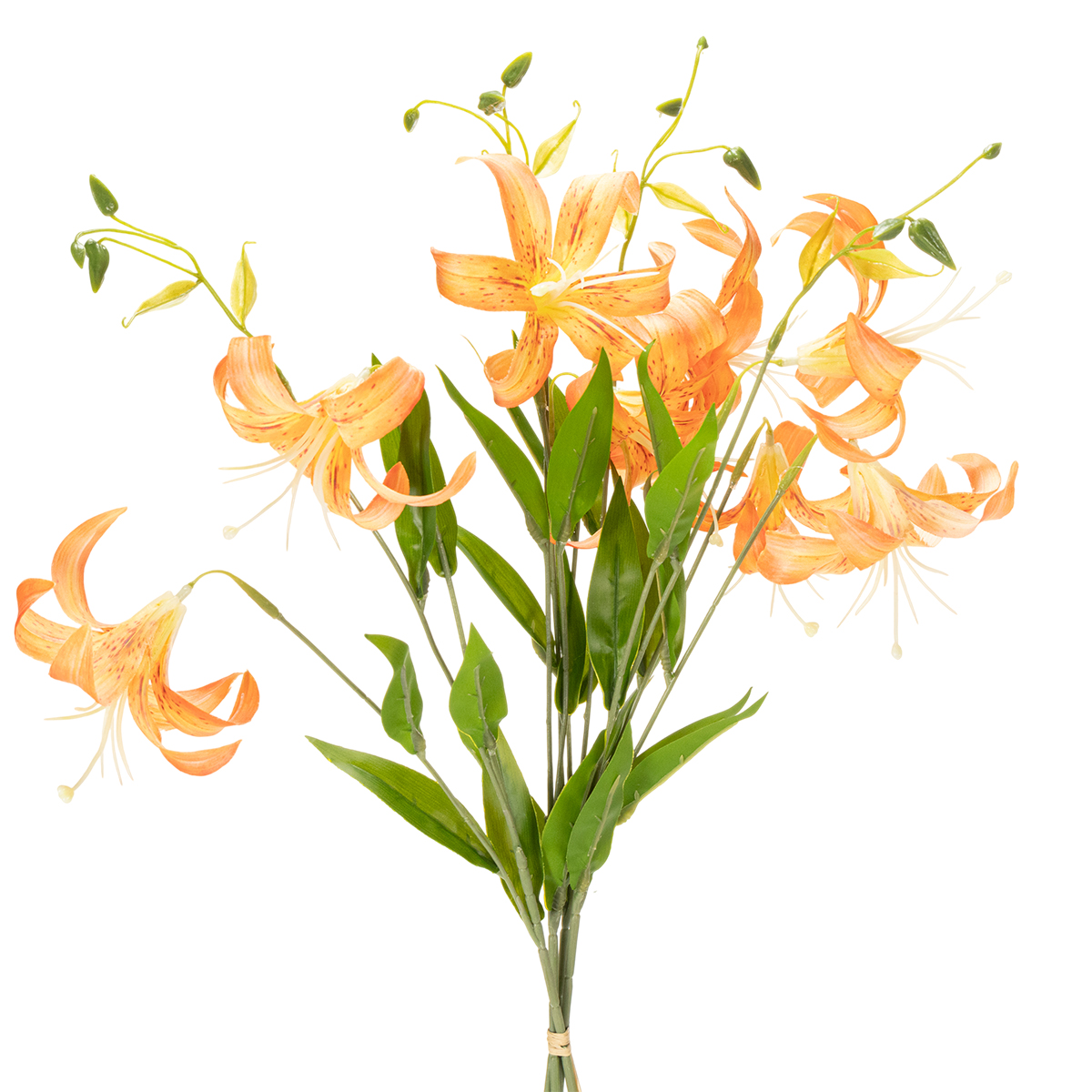 Proč umělé lilie? Je to jednoduché: ušetříte si starosti s údržbou a stále si užijete vzhled čerstvě naaranžované dekorace. Díky svým zářivým oranžovým květům vypadají tyto lilie fantasticky v jakémkoli prostředí. Kombinace polyesteru a plastu zajišťuje realistický efekt, zatímco flexibilní stonky umožňují snadné nastavení a umístění. Umístěte je do vysokých váz pro elegantní recepci nebo je elegantně aranžujte na stůl – doplní jakýkoli styl, ať už klasický, moderní nebo boho. Tyto umělé květiny jsou obzvláště oblíbené jako svatební dekorace: atmosférické aranžmá pro obřad, okouzlující stolní dekorace nebo působivé vstupní dekorace lze vytvořit během chvilky. A jako bonus navíc: květy nejenže vydrží váš zvláštní den, ale zůstanou krásnou památkou na mnoho let. Plánujete akci a potřebujete květinové poutače? Ať už se jedná o velkoformátové dekorace nebo detailní stolní aranžmá, tyto lilie jsou přesně to pravé. Doplňte jejich nádheru odpovídajícími doplňky, jako jsou jemné stuhy, umělé trávy nebo svícny – možnosti jsou nekonečné.