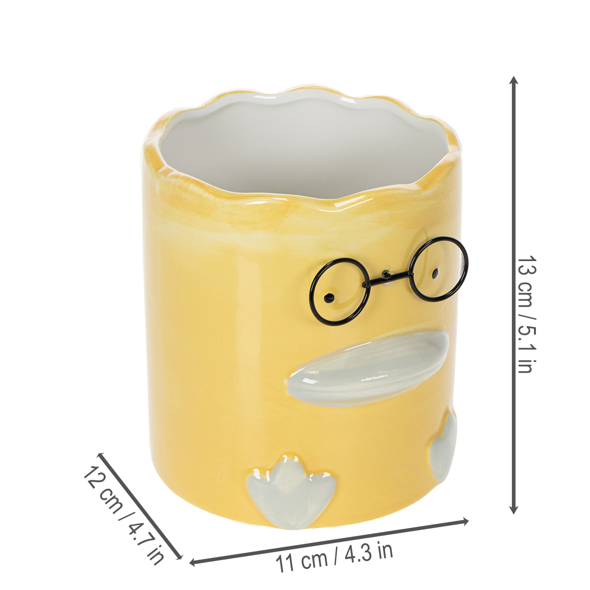 Tato žlutá keramická váza se zvířecím motivem v sobě spojuje funkčnost a estetiku skutečně výjimečným způsobem. S výškou 13 cm a průměrem 12 cm nabízí dostatek prostoru pro květiny, sušené květiny nebo dokonce propisky a kancelářské potřeby. Vysoce kvalitní keramika zajišťuje stabilitu a odolnost, zatímco okouzlující design kachny s jemnými detaily, jako je vlnitý otvor a rozmarné sklenice, dodává váze moderní a humorný nádech. Tato váza je ideální pro vystavení světlých sušených květin nebo čerstvě řezaných květin. Pro přirozenější vzhled ji lze také osázet malými pokojovými rostlinami, jako jsou sukulenty. Je také ideální pro uložení propisek nebo jiných drobných předmětů, což z ní činí praktický doplněk do kanceláře nebo dětského pokoje. Tento dekorativní kousek není jen krásným doplňkem vašeho domova, ale také skvělým dárkem pro přátele nebo na kolaudaci. Dokonalá kombinace praktického využití a dekorativní krásy!