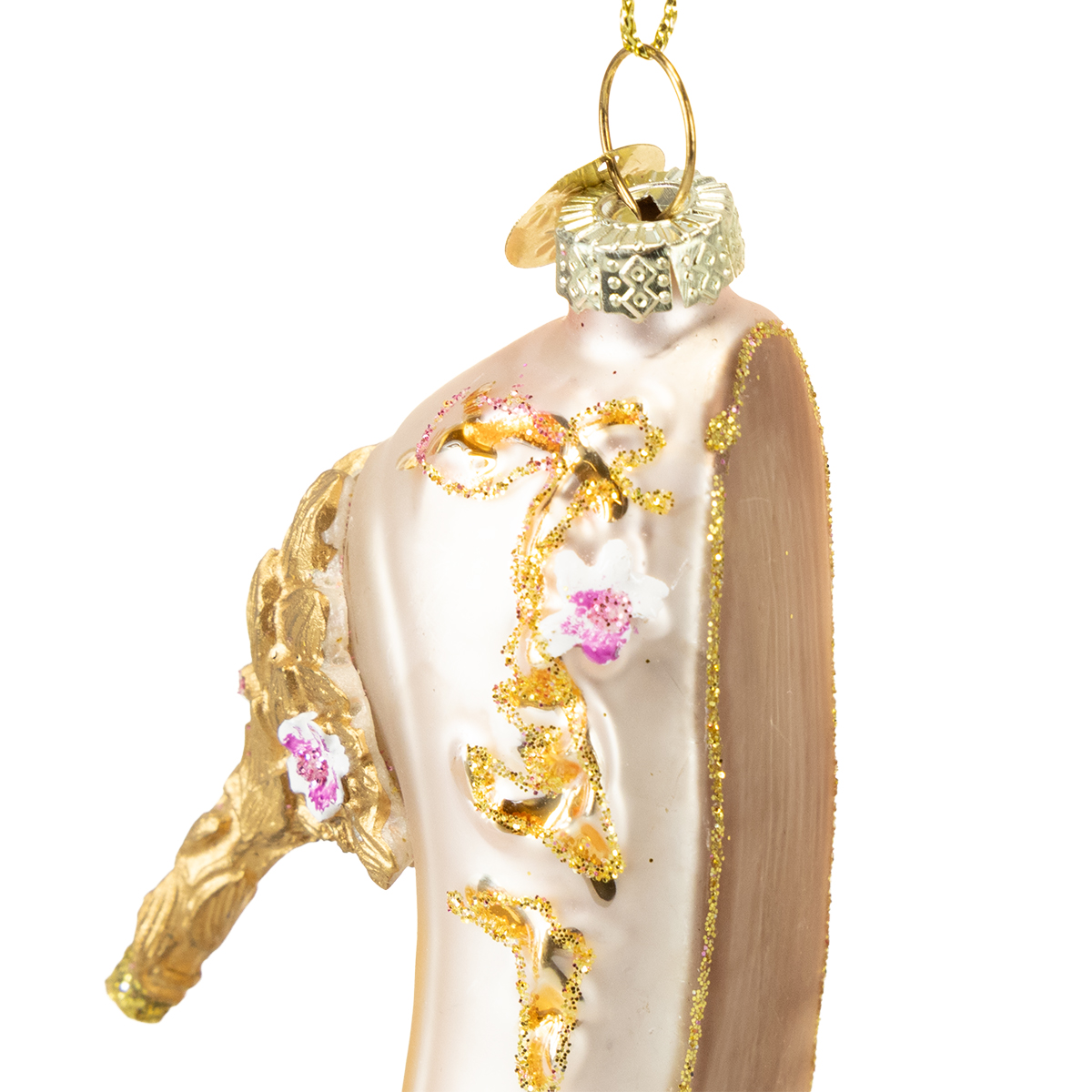 Každá vánoční ozdoba na stromeček má svůj zvláštní příběh – a tyto krásné skleněné boty nejsou výjimkou! Jejich jemné detaily, jako například umělecky tvarované zlaté květinové dekorace, je činí skutečně výjimečnými. Díky poutku na zavěšení se snadno připevní na větve, girlandy nebo dokonce na ozdobné větvičky ve váze. Jemný růžový povrch má příjemný saténový vzhled, který v kombinaci se zlatou barvou vytváří slavnostní a harmonické barevné schéma. Plastové podpatky dodávají botám dodatečnou stabilitu, aniž by ubíraly na celkovém elegantním dojmu.