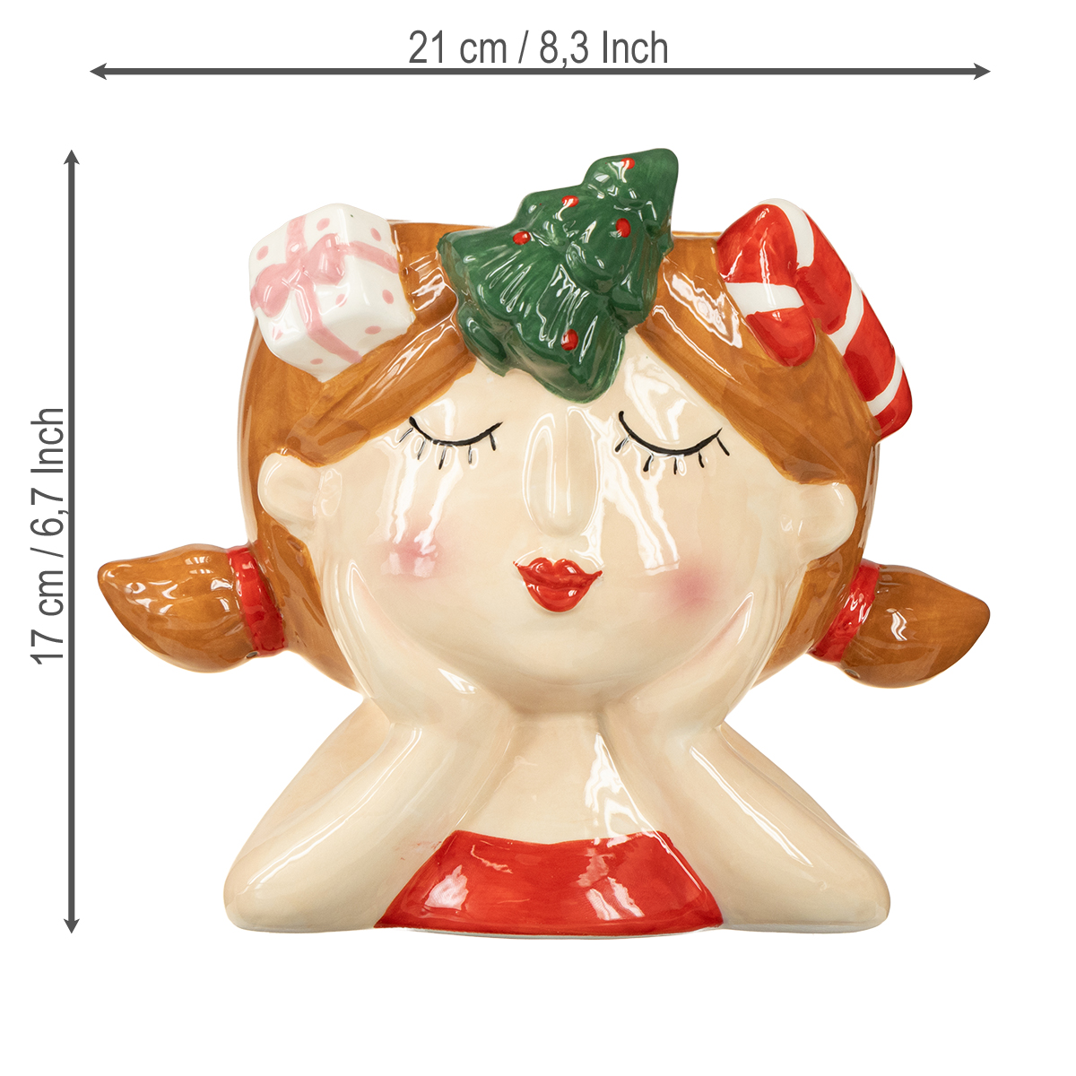 Vánoce jsou za rohem a vy hledáte něco, co by vaši sváteční výzdobu učinilo skutečně jedinečnou? Pak vám tento okouzlující keramický květináč okamžitě vykouzlí úsměv na tváři! Díky svému okouzlujícímu designu ve tvaru zasněné dívky s vánočními ozdobami ve vlasech tento květináč nejenže vnese do vašeho domova veselou vánoční atmosféru, ale také krásně zvýrazní jakoukoli rostlinu nebo vaše adventní dekorace. Obzvláště nápadné jsou milé detaily busty, jako jsou červené stužky, její zasněný pohled a malé vánoční prvky, jako je mini vánoční stromeček a cukrová hůl ve vlasech. Díky tomu je tento květináč ideální pro každého, kdo chce do svých dekorací vnést nádech humoru!