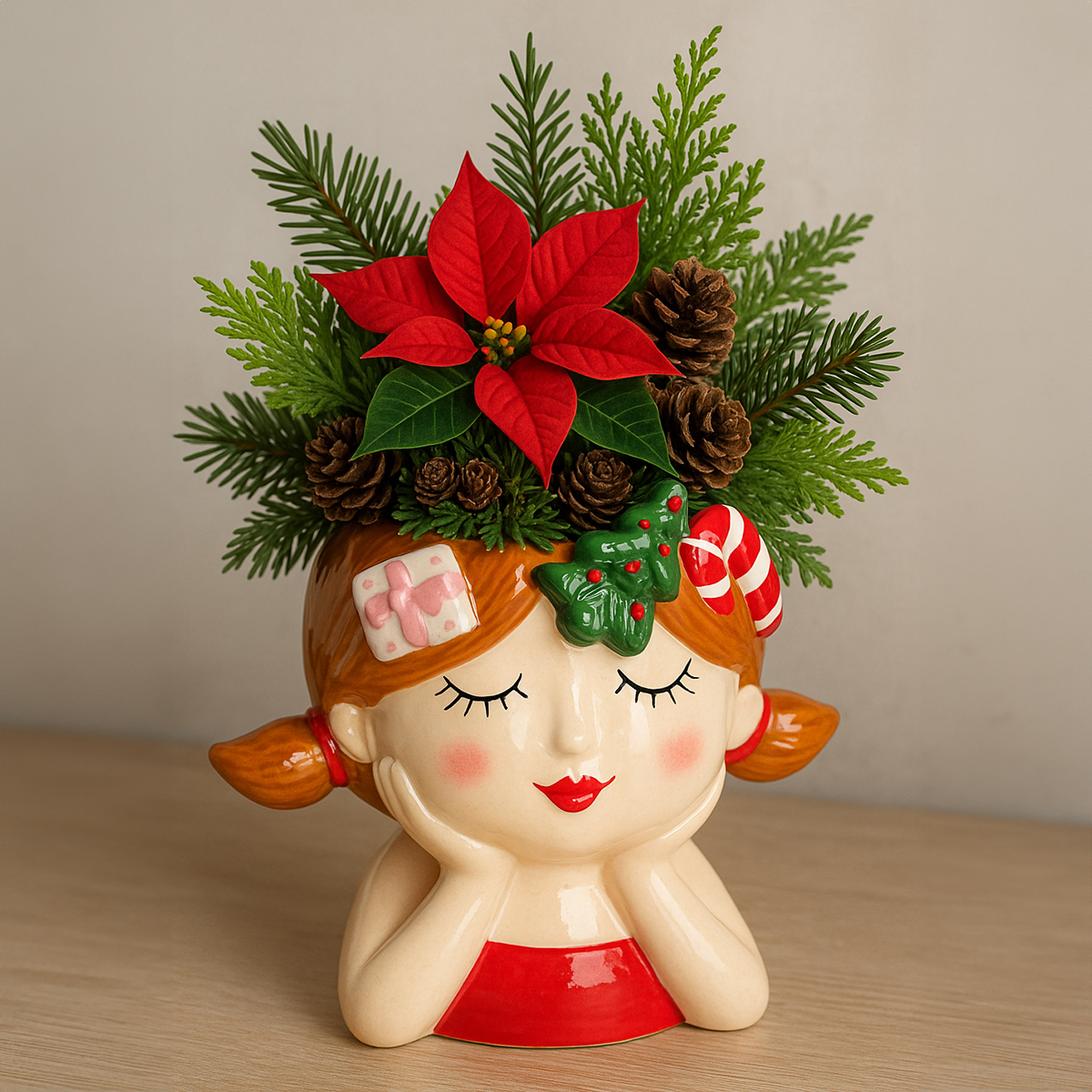 Název produktu: Vánoční dekorativní květináč s keramickou hlavou rostliny pro dívky, výška 17 cm