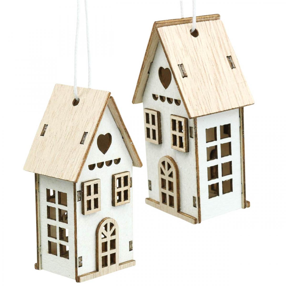 Roztomilá dřevěná dekorace na vánoční stromeček je láskyplně navržena ve stylu venkovského domu. Malé dekorativní dřevěné domečky v bílé barvě zdobí okenní rámy, dveře a několik malých půlkulatých oken a jedno ve tvaru srdce. Se stuhou nahoře lze krásné dekorativní domečky zavěsit jako ozdoby na vánoční stromeček do vánočních ozdob.