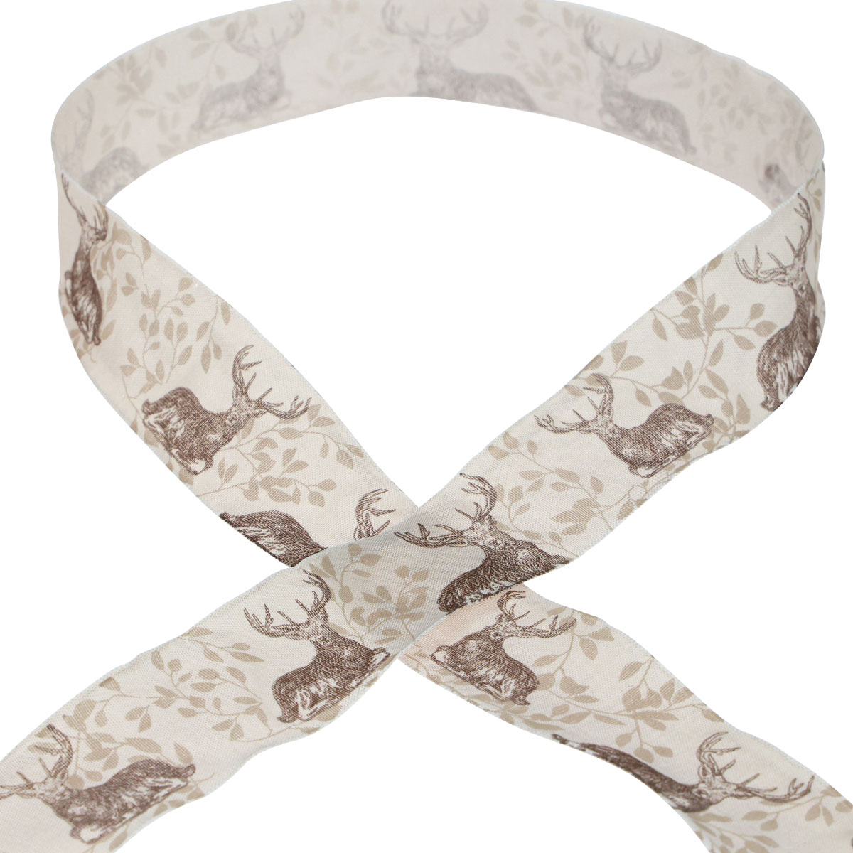 Světle hnědá dárková stuha se dvěma motivy jelena a béžovými listy na světle hnědém podkladu dodává slavnostní atmosféře seversko-rustikální nádech. Stuha je pěkný poutač, který můžete umně zakomponovat například do adventních věnců, aranžmá a vánočních souborů. Tímto způsobem můžete také realizovat kreativní nápady na dekorace pro vaši firmu a pokoje pro hosty.