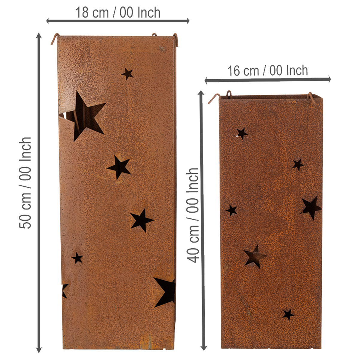 Tyto svícny jsou dostupné v sadě po dvou s výškou 50 centimetrů a 40 centimetrů. Nechte svůj balkon nebo terasu zazářit hvězdami v dekoraci patiny.