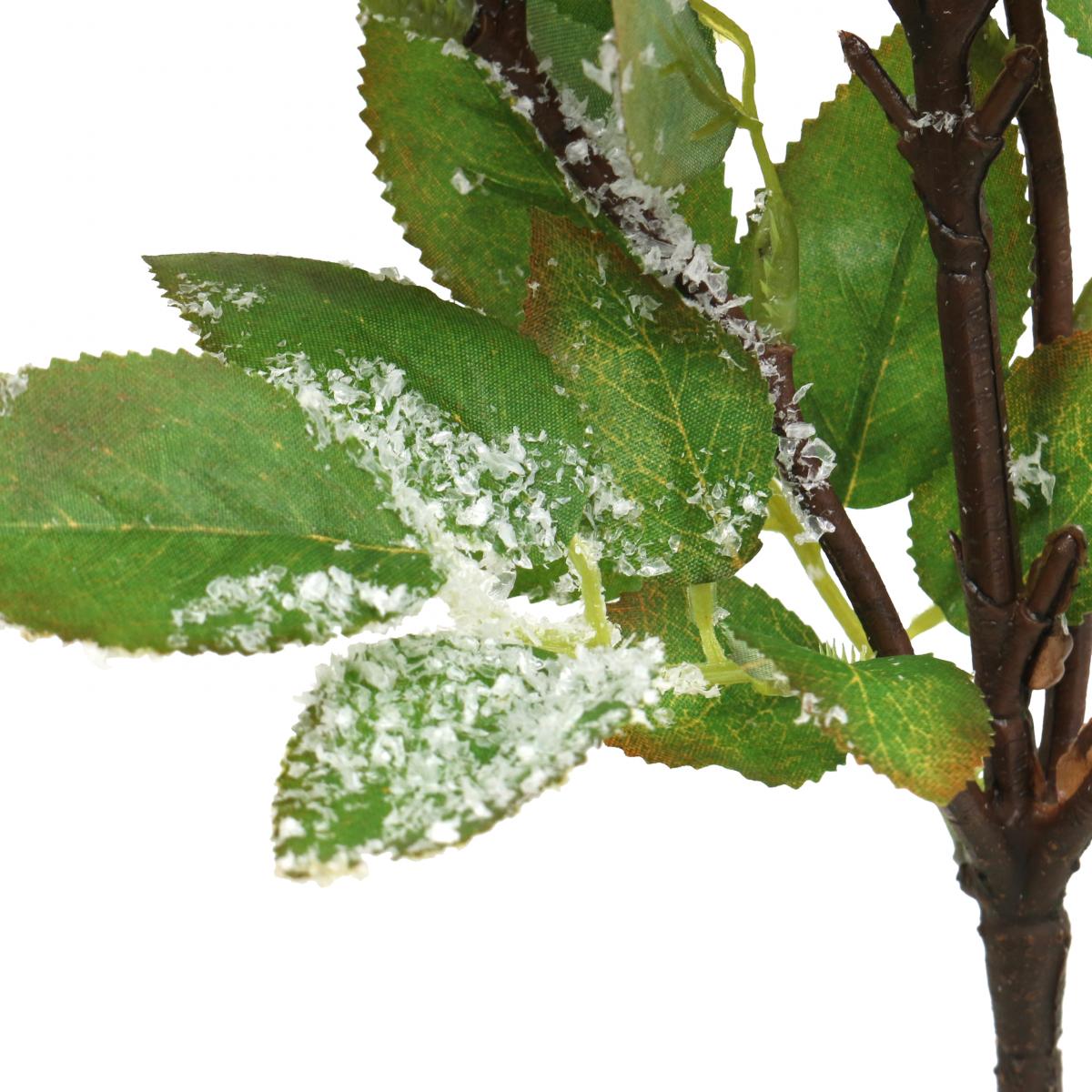 Dlouhá rukojeť ozdobné větve má kovové jádro, což znamená, že ozdobu větve lze flexibilně zakomponovat do jakékoliv umělé květinové dekorace. Dekorativní větev se nahoře několikrát dělí a je pokryta četnými bílými bobulemi s umělým sněhem a zelenými listy.