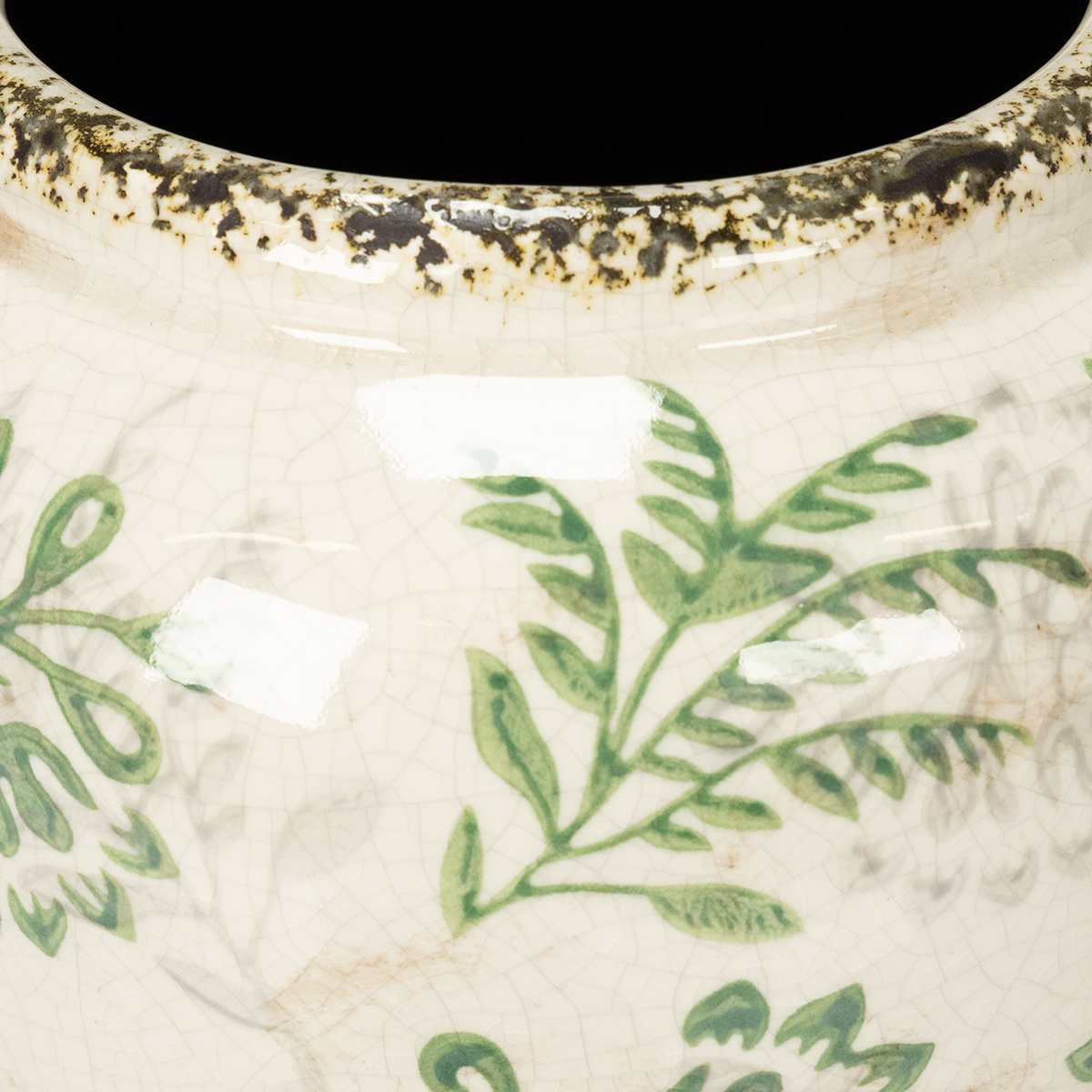 Tato váza s rostlinným vzorem kombinuje stylovou estetiku s praktickým využitím. Na první pohled okouzlí jemný zelený rostlinný vzor na bílé keramice – harmonická kombinace, která vyzařuje decentní svěžest a lehkost. Je ideální pro každého, kdo hledá do svého domova speciální poutač. Je uspořádaná ve venkovském stylu a harmonicky se hodí k nábytku z přírodního dřeva nebo ratanu. Díky své decentní eleganci však vynikne i v moderním skandinávském prostředí.