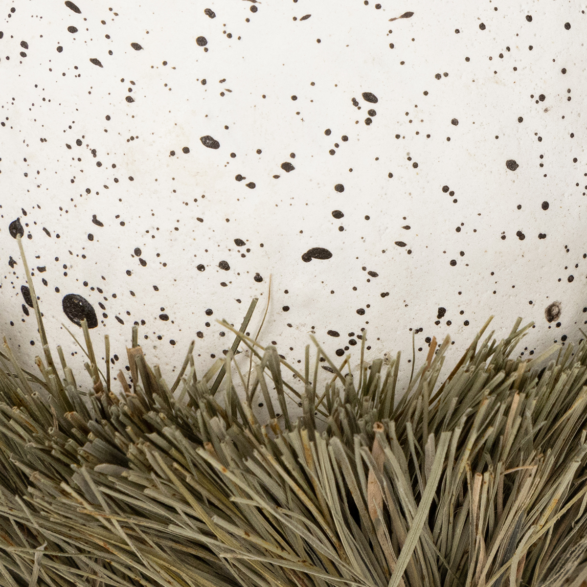 Bílé ozdobné vajíčko s hnědými tečkami je umístěno v lůžku z pravé sušené trávy, které je položeno na věnec z malých polen. - Celé to tedy nejen vypadá jako opravdové ptačí hnízdo, které byste mohli najít v přírodě, ale je také bezpečné a stabilní.