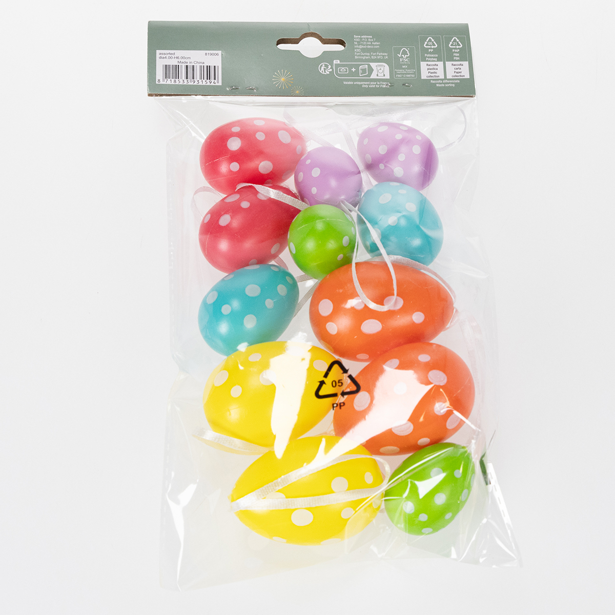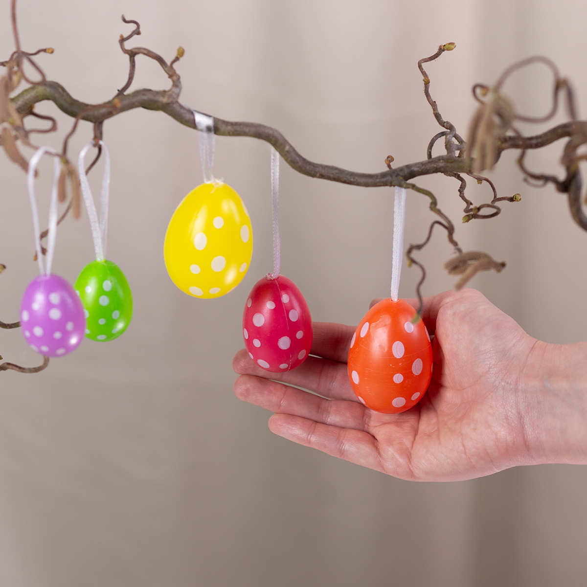 Tato barevná závěsná velikonoční vajíčka jsou perfektním doplňkem pro vaše velikonoční dekorace. Sada obsahuje 12 vajíček vyrobených z odolného plastu, takže je děti snadno zavěsí. Barvy žlutá, modrá, zelená, oranžová, růžová a fialová spolu s bílými puntíky vytvářejí zářivý a hravý vzhled. Velké vajíčko je vysoké přibližně 6 cm – ideální velikost pro zavěšení na větve, do květinových aranžmá nebo na velikonoční stromeček.