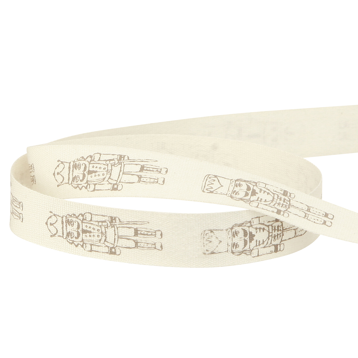 Dekorativní stuha krémové barvy ve vintage stylu zaujme svou jemností a láskyplně navrženými figurkami louskáčků. Díky hladké textuře a šířce 15 mm se s ním snadno pracuje a dodává jakémukoli balení, vánoční dekoraci nebo řemeslné práci klasický, slavnostní dojem. Páska o délce 20 metrů nabízí dostatek materiálu pro četné kreativní projekty.