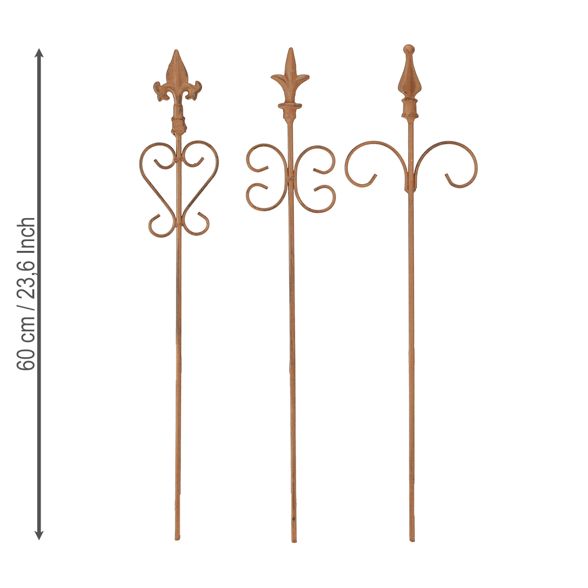 Naše vintage zahradní dekorace jsou perfektním doplňkem pro váš venkovní prostor. Tyto dekorativní kovové zahradní kolíky s nerezovou povrchovou úpravou ozdobí květinové záhony a záhony a dodají vaší předzahrádce stylové akcenty. Každá ze tří tyčí se vyznačuje jedinečným designem, který získává své zvláštní kouzlo ze skutečné rzi. Rustikální vzhled se perfektně hodí do zahrad, které jsou založeny na shabby chic nebo venkovském stylu. Tyče jsou všestranné a jsou ideální pro značení cest nebo zavěšení pohádkových světel. Dodejte své zahradě starožitný nádech a udělejte z ní pozornost. Využijte možnost navrhnout si svou zahradu individuálně a stylově s těmito kovovými tyčemi.