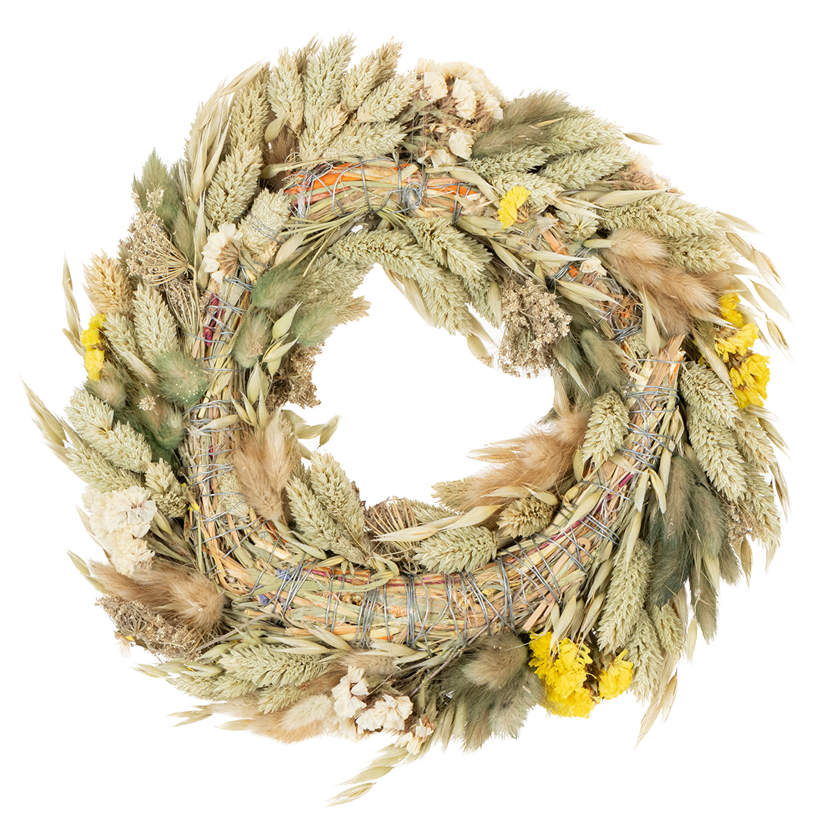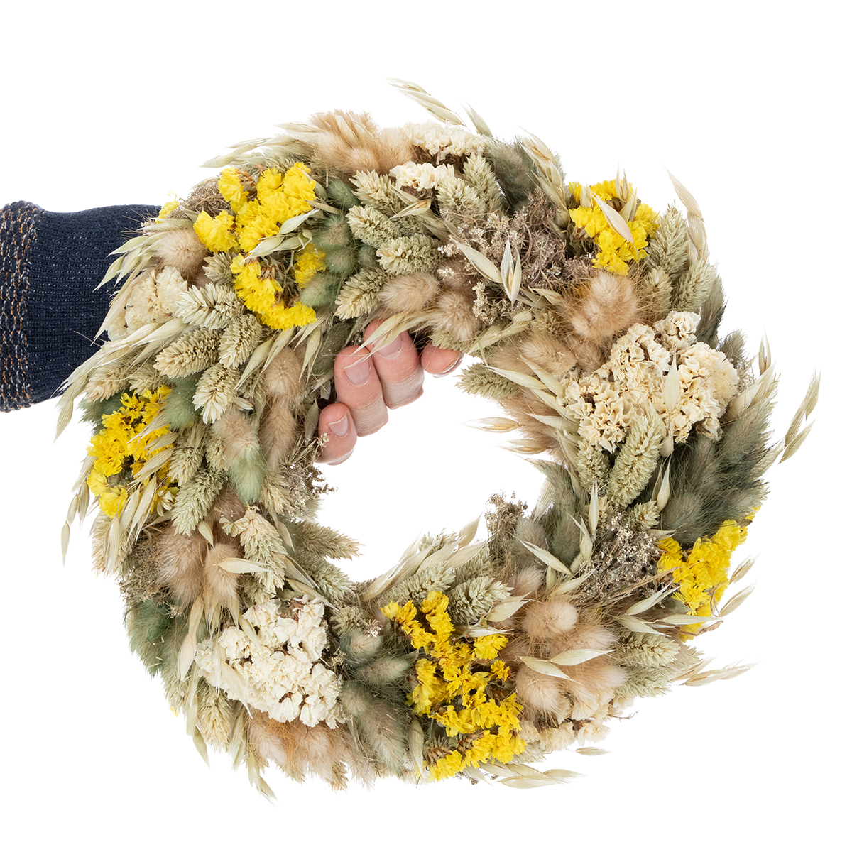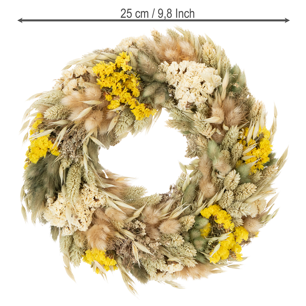 Díky přírodním materiálům vyzařuje věnec ze sušených květin lehkost, která v kombinaci s květinami v béžových a žlutých tónech vytváří harmonický celkový vzhled. Je snadno udržovatelný, odolný a zachovává si svůj krásný vzhled po celou dobu. K čištění stačí věnec občas otřít měkkým kartáčem.