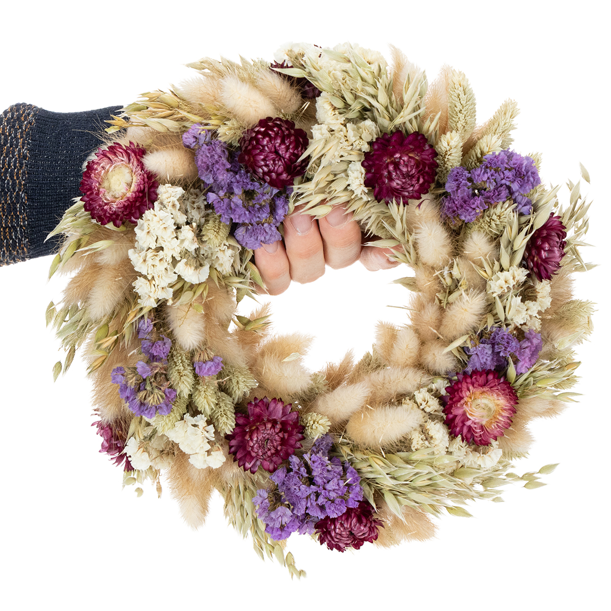 Péče je obzvláště jednoduchá: Jemně poklepejte věnec, abyste odstranili prach, a vyhněte se přímému slunečnímu záření, aby se zachovaly barvy. Vaše slavnostní dekorace ze sušených květin tak bude vždycky poutavá!