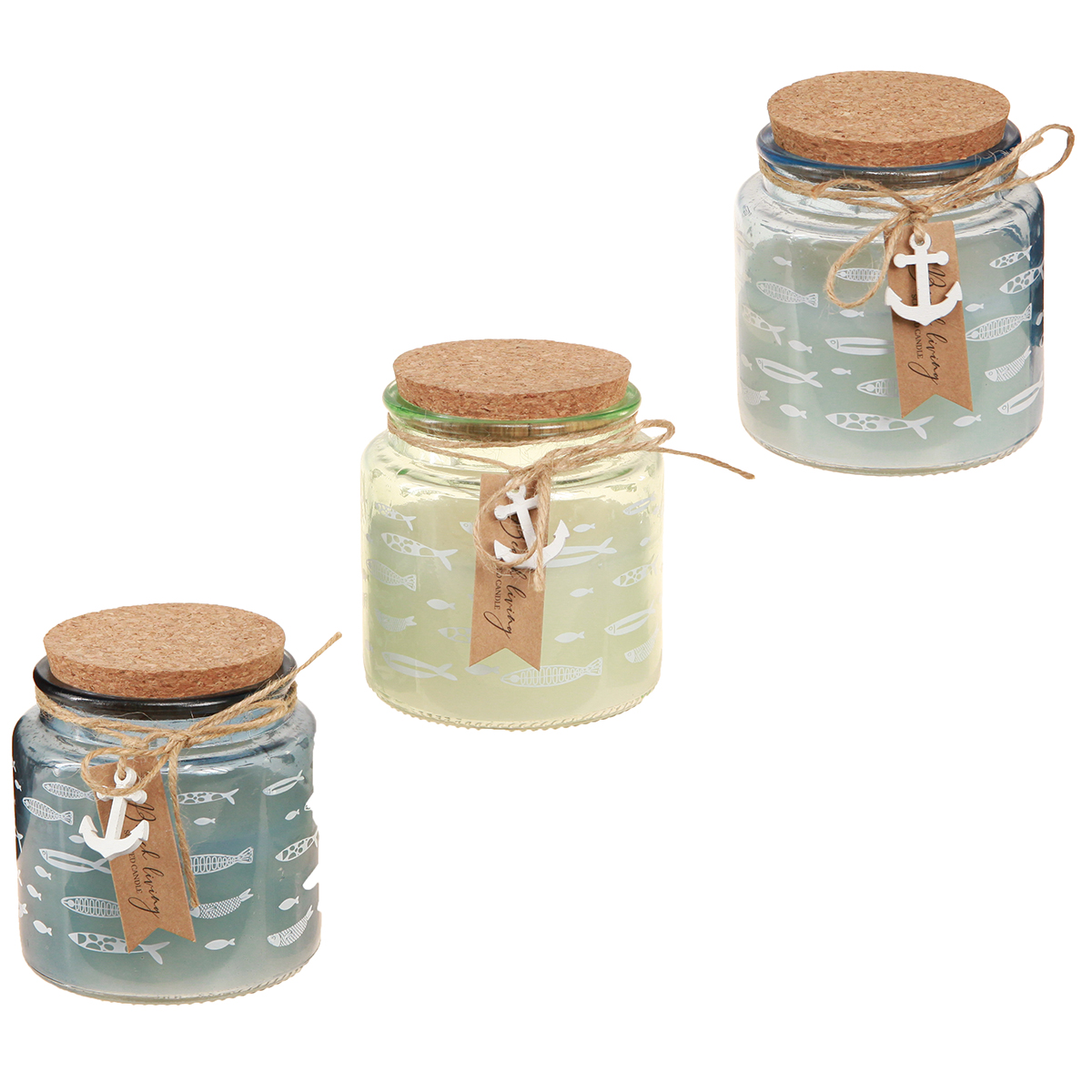 Zažijte uklidňující pocit čerstvého mořského vzduchu u vás doma s našimi nádhernými vonnými svíčkami ve skle. Tyto nádherné svíčky, dvě v modré a jedna v zelené, kombinují svůdné aroma „čerstvé bavlny“ s přitažlivým námořním designem, který promění každou místnost v oázu pohody. Skleněné nádoby zaujmou atraktivním modrým nebo zeleným tónovaným designem, na kterém je potištěná stylová bílá ryba, kterou doplňuje ozdobná mašle z jutové šňůry s bílou kotvou. Praktické korkové víko doplňuje design a zajišťuje dlouhodobé uchování aroma. Tyto elegantní vonné svíčky jsou ideální do obývacího pokoje pro vytvoření útulné a relaxační atmosféry, stejně jako do koupelny. Perfektní jako dárek nebo k dotvoření vaší vlastní námořní dekorace – naše vonné svíčky ve skle jsou perfektní volbou pro všechny milovníky námořního stylu.