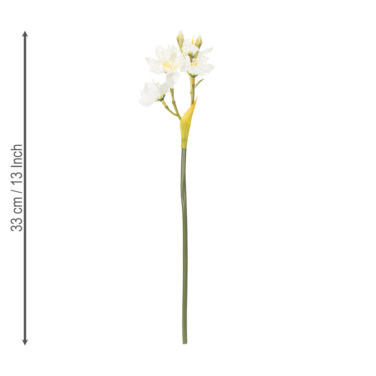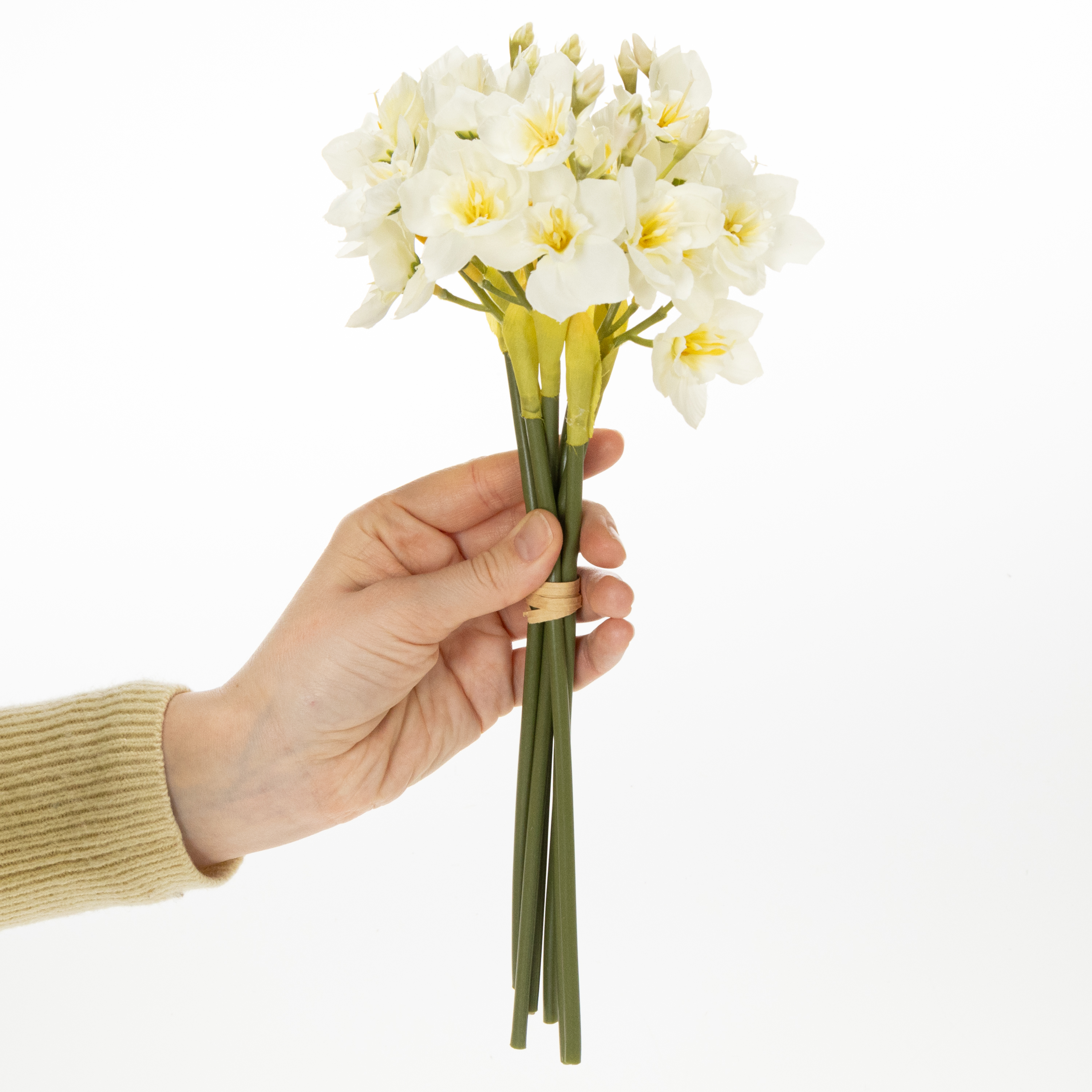 Dokonalý doplněk pro vaši svatbu nebo sezónní květinovou výzdobu: Naše větvička narcisu v sobě spojuje krásu a praktickou všestrannost. Představte si, jak tyto umělecky vytvořené bílé květy doplní váš stůl nebo vytvoří romantickou svatební kytici. Vaši hosté budou nadšeni! S délkou 33 cm a realistickým designem vypadají tyto umělé narcisy, jako by byly čerstvě utržené – a to vše bez jakékoli údržby.