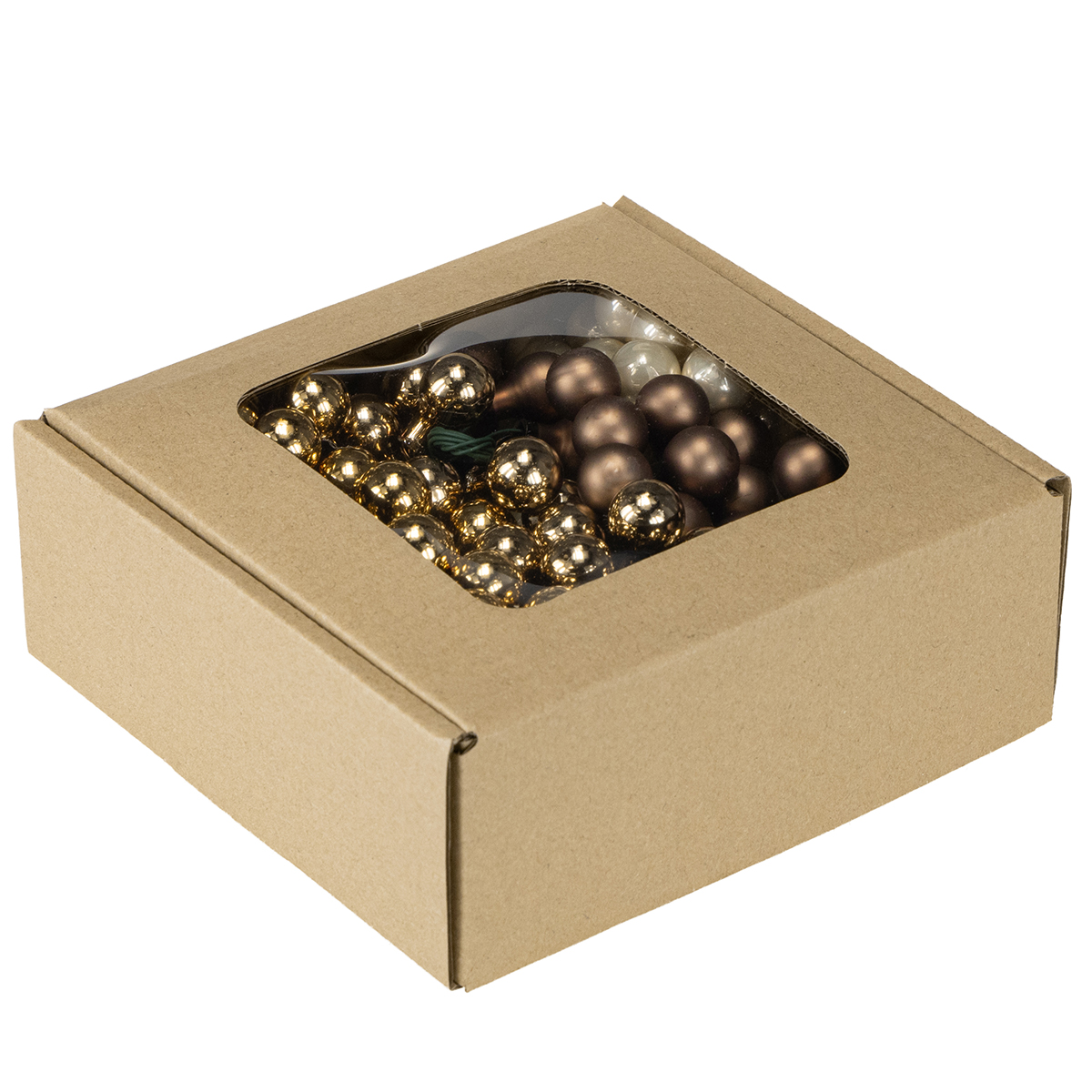 Zrcadlové bobule v hnědé a zlaté barvě jsou v sadě 140 kusů s celkem 4 různými barvami ve stejných částech: starozlatá, bílá a zelenohnědá v lesklé a plavá hnědá v matu. Malé skleněné hlavičky mají všechny průměr kolem 1,5 centimetru a včetně zeleného řemeslného drátu velikost kolem 15 centimetrů.